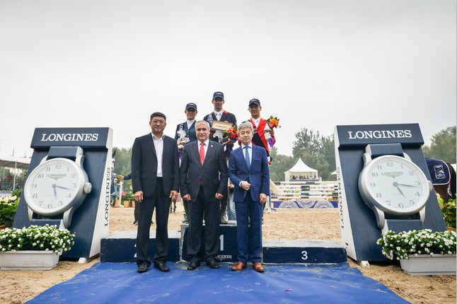Awards ceremony, the top row from left to right: Runner-up Swiss rider Clarissa Crotta, champion Hong Kong, China Rider Lin Lixin, second runner-up Chinese rider Zhao Zhiwen; Bottom row: State Sport General Administration bicycle fencing management center Mr. Wang Wei, Vice Chairman of China Equestrian Association, Mr.Ingmar De Vos, Secretary General of International Equestrian Federation, Mr. Li Li, Vice President of Longines China.