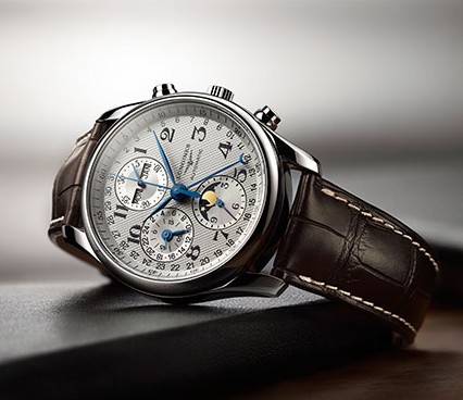 Longines Mingjiang series steel moon phase chronograph, built-in L678 self-winding mechanical movement, 28,800 times per hour swing. Diameter of 40 mm watch, barley grain pressure on the silver surface pattern. Show hours, minutes, seconds, half-moon central pointer indicates the date. 9 o'clock position set 24-hour dial; 6 o'clock position moon phase display function and 12-hour cumulative dial; 12 o'clock position set 30 minutes cumulative dial, and with the week and month display window. Transparent case back so exquisite movement at a glance. Equipped with brown alligator strap, waterproof up to 3 bar.