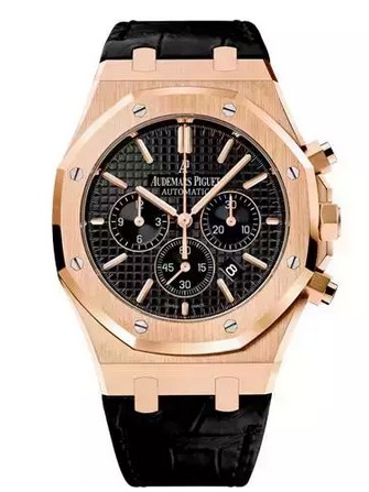 Audemars Piguet This Royal Oak Chronograph is a self-winding chronograph with date display and small seconds at 6 o'clock, a 41mm rose gold 18K case, black dial and black strap. Black dial engraved Grande Tapisserie large plaid decorative pattern, with a rose gold fluorescent three-dimensional time scale and the Royal Oak pointer. Hand-crafted large square black alligator strap with 18K rose gold AP folding clasp. Inside carries a Caliber 2385 self-winding movement. Reference price: 287000 yuan.