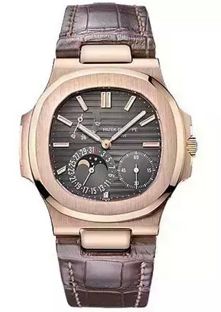 Patek Philippe Nautilus Series 5712R-001 rose gold watch case diameter of 40mm, the dark brown dial with a gold-plated fluorescent coated three-dimensional time scale, small seconds dial, pointer moon phase display, date display and power Save the display. Inside the loaded 240 PS IRM C LU self-winding mechanical movement. Reference price: 393,800 yuan.