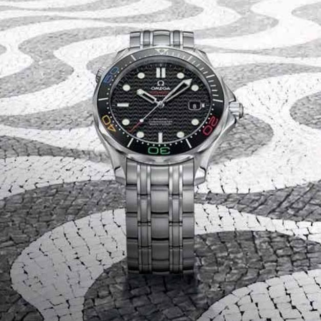 This timepieces Pierre perfect fusion of Omega's professional watchmaking technology and extraordinary craftsmanship. Inspired by Rio's prestigious Copacabana beach, Omega evolved the mosaic design on the sidewalk into a rippled pattern on a black lacquered dial. The one-way rotating dive watch bezel is also black, made of polished black ceramic. However, the real distinctive feature of the bezel design is the red, green, yellow and blue lacquer figures that surround not only the passion and vitality emanated from Rio, but also the five Kind of color