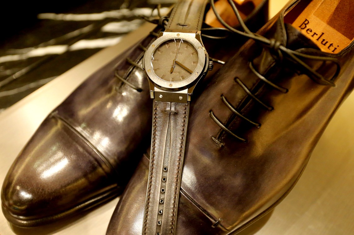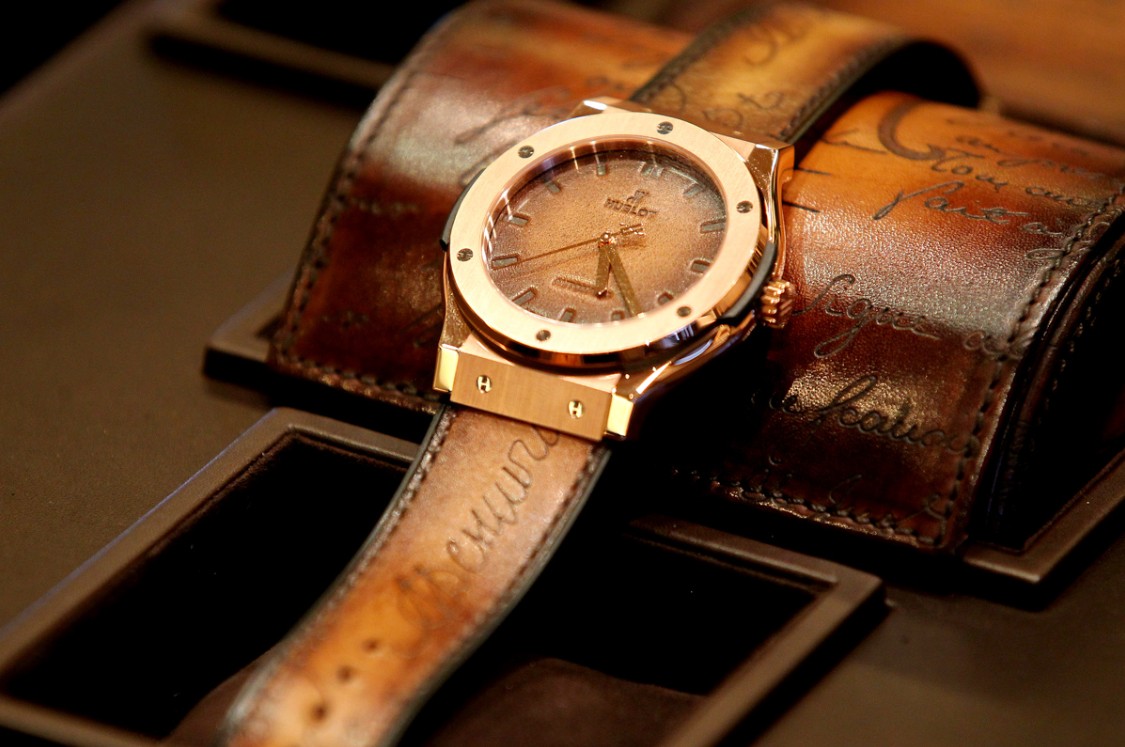 Hublot watch classic integration Berluti black watch strap selection Venezia calfskin and Gaspard process