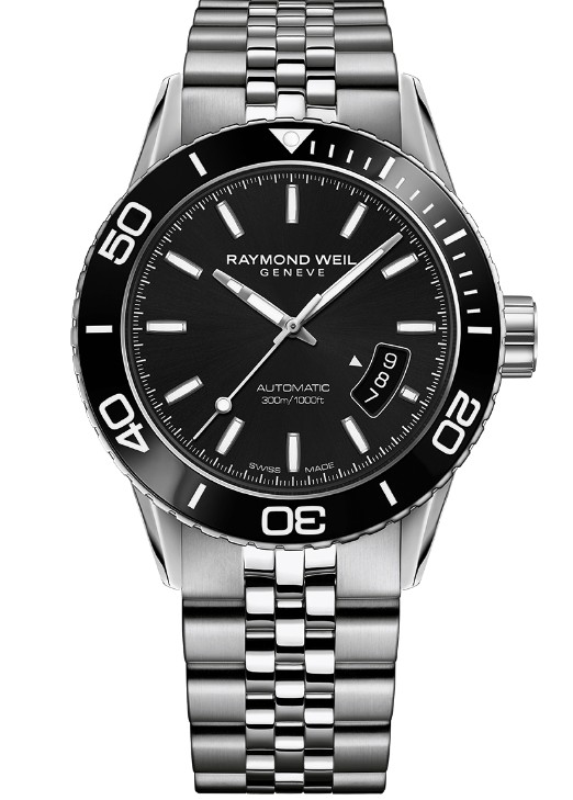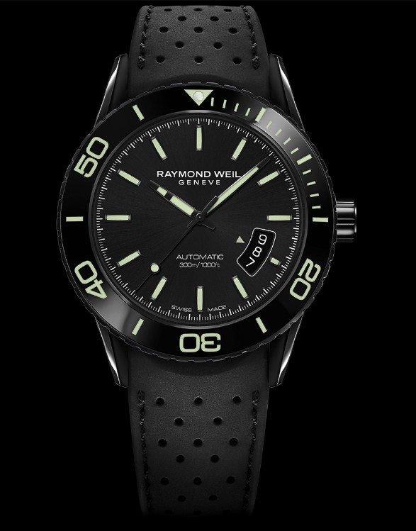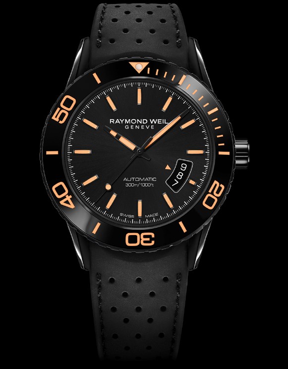 The Freedom Knight watch, created for the sailing race, is elegant and full of power with a 42.5 mm diameter, matte and black PVD coating, echoing the aesthetics and dynamics of a professional diving watch. Watch device Made of ceramic one-way rotating bezel engraved with a white, green or orange luminous scale; screw-in crown to ensure water resistance. The main elements of the black dial, including the time scale and the pointer, are joined Super-Luminova® luminous materials to ensure perfect time reading. Rubber strap with double safety folding clasp, stainless steel diving extension system, easy to adjust the strap length to tie in the diving suit. With 300 meters waterproof function, this watch through a series of stringent tests to ensure its impact resistance, antimagnetic, compressive and temperature resistance and other performance. Automatic watch movement, providing up to 38 hours of power. The Raymond Weil brand new Freedom Knight Watch supports REALTEAMB members in the most extreme maritime environment.