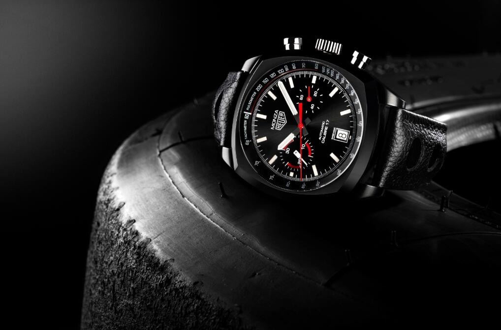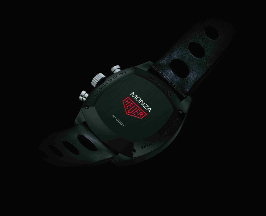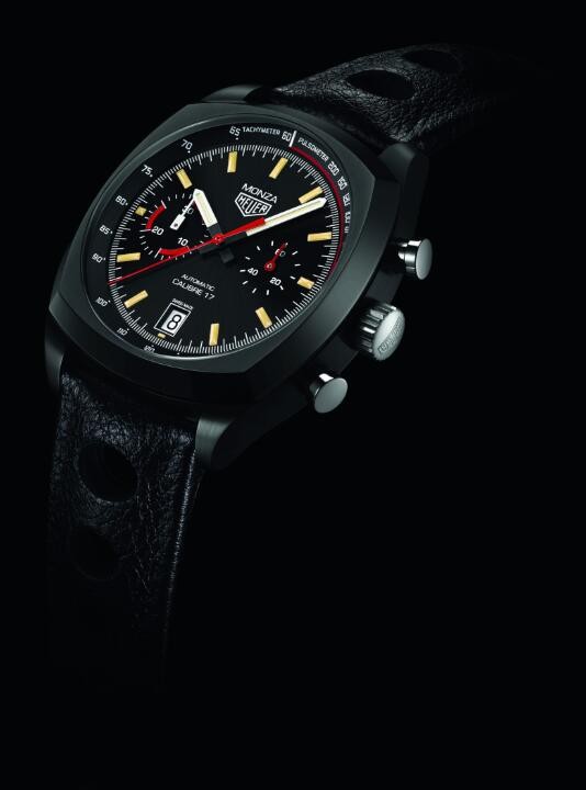 As a link between the past and the future, Heuer Monza Chronograph case Zhen selected 5 titanium Huan (previously used steel), so watch more light, more seismic performance. Watch material by titanium carbide coating was matte black, filling its strong gas field.