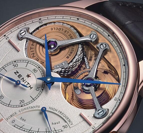 The chain as a transmission between the barrel and journal consists of a 575 section and is up to 7 feet long. Do not look beautiful and meticulous chain, it can repeatedly load up to 3 kg. Zenith manufacturers took two years to repeatedly practice the design in a very small space and the watch as the application.